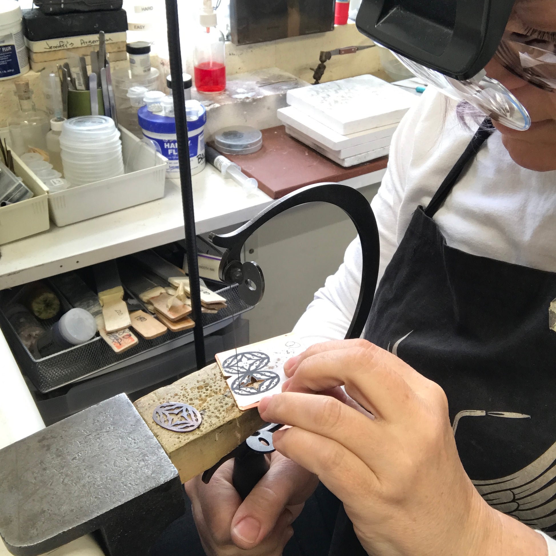 Demos will include: Setting up to saw, piercing, posture, holding tools, saw stroke, and saw line clean up. We also address problem-solving. We will be discussing the best options for you so you can be an informed consumer. We recommend practicing on a 20g copper sheet with a design from the provided template.